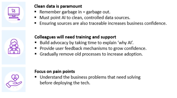 Of course, adoption isn’t just a technical challenge; it’s also about people and change management. 87% of finance leaders report talent shortages limiting AI progress[5], while 43% of workers still fear AI-driven job loss[6]. So, how do you maximise AI value in the contact centre without compromising security, ethics or customer trust?